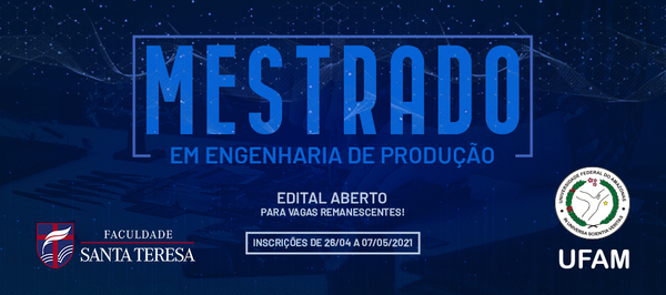 [vc_row][vc_column][vc_column_text]A Faculdade Santa Teresa, em parceria com a Universidade Federal do Amazonas (Ufam), lançou o Edital com 9 vagas remanescentes para o Mestrado em Engenharia de Produção. Os interessados já podem consultar as informações sobre prazos, linhas de pesquisa e demais detalhes. O prazo de inscrições é de 26/04 a 07/05/2021.