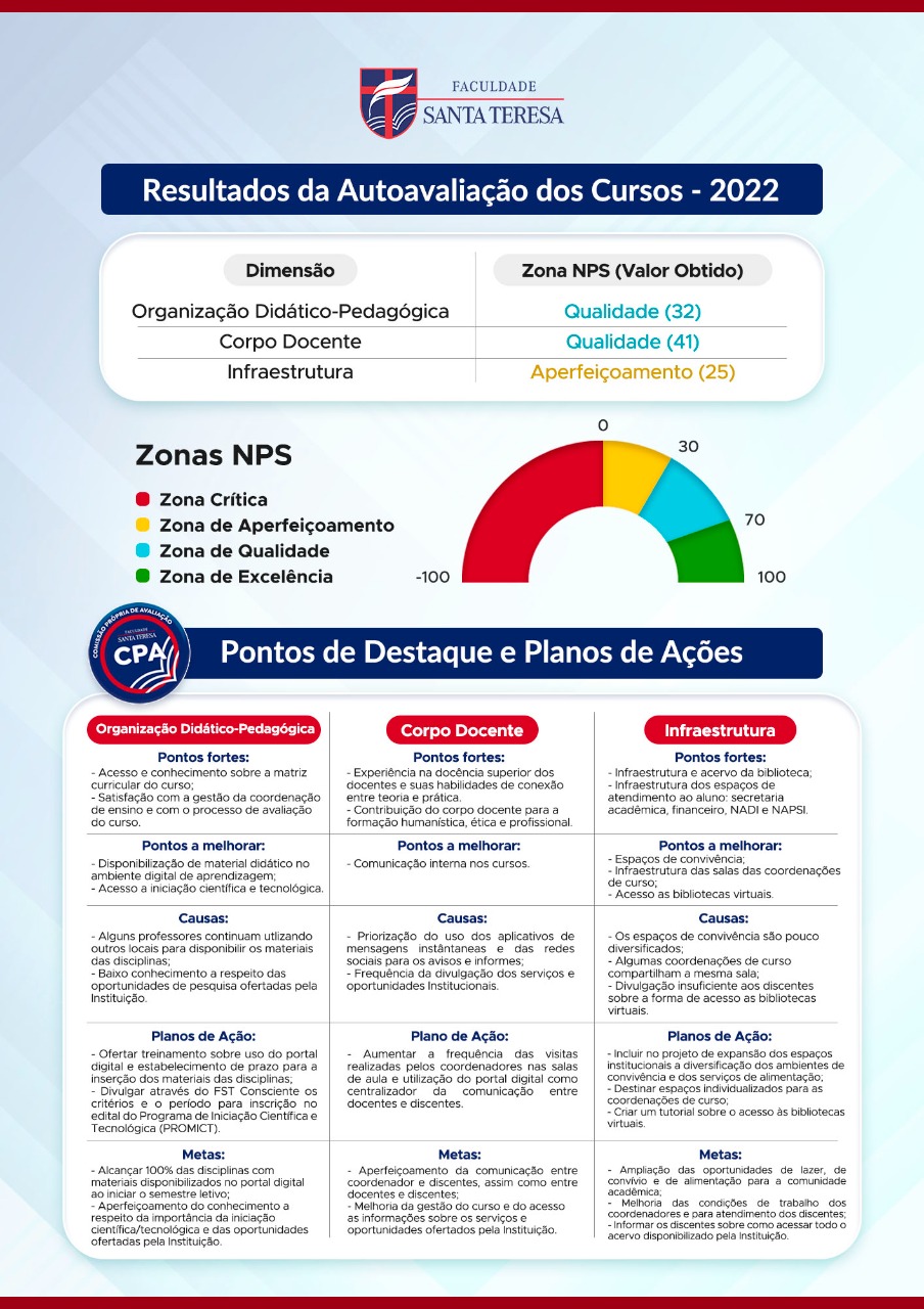 A Comissão Própria de Avaliação (CPA) é uma instância de atuação autônoma em relação aos órgãos da Instituição, responsável por coordenar os processos de avaliação interna (autoavaliações) da Faculdade Santa Teresa – Fortaleza. A CPA é composta por membros que representam todos os segmentos da comunidade acadêmica e um representante da sociedade civil, os quais trabalham em conjunto para conduzir as avaliações referentes ao ensino, a extensão, a pesquisa, a infraestrutura e a gestão da Instituição.