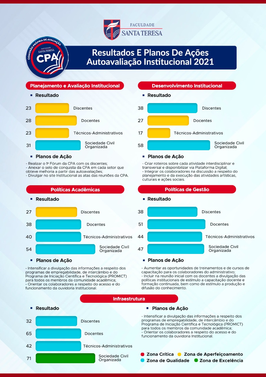 As pesquisas de autoavaliação contarão com a participação dos alunos, dos professores, da equipe administrativa e da sociedade civil para conhecer a percepção dos participantes referente aos serviços institucionais. Os resultados serão analisados e utilizados em conjunto com os provenientes das avaliações externas (realizadas pelo MEC) para subsidiar a construção de planos de ações para melhorias. Os resultados das avaliações serão divulgados e discutidos semestralmente. A CPA possui um importante papel no acompanhamento da implementação das melhorias para fomentar o constante desenvolvimento da Faculdade Santa Teresa de Boa Vista e o seu impacto na sociedade.