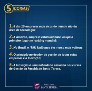 O Talk Empreendedorismo e Inovação da Faculdade Santa Teresa é um tipo de evento em que o diálogo coletivo sobre um tema é realizado e conta com participação de profissionais de mercado e intermediação de um mediador. Na Faculdade Santa Teresa, o Talk é um evento institucional realizado semestralmente e busca discutir experiências e conhecimentos relacionados ao empreendedorismo, inovação e liderança.